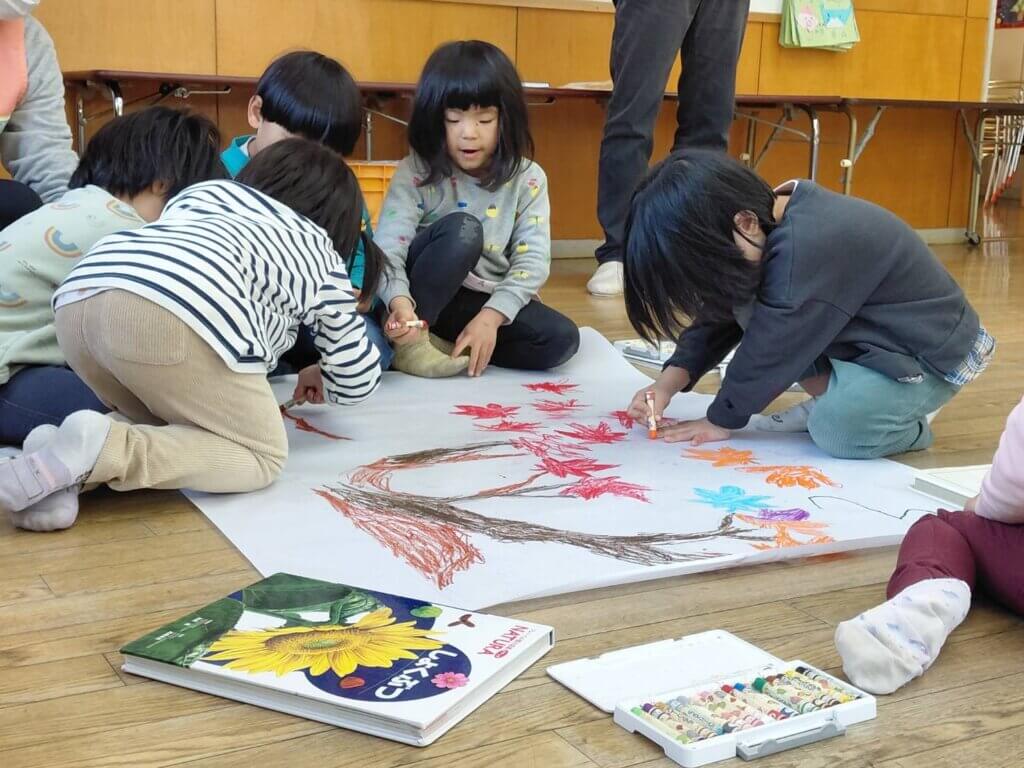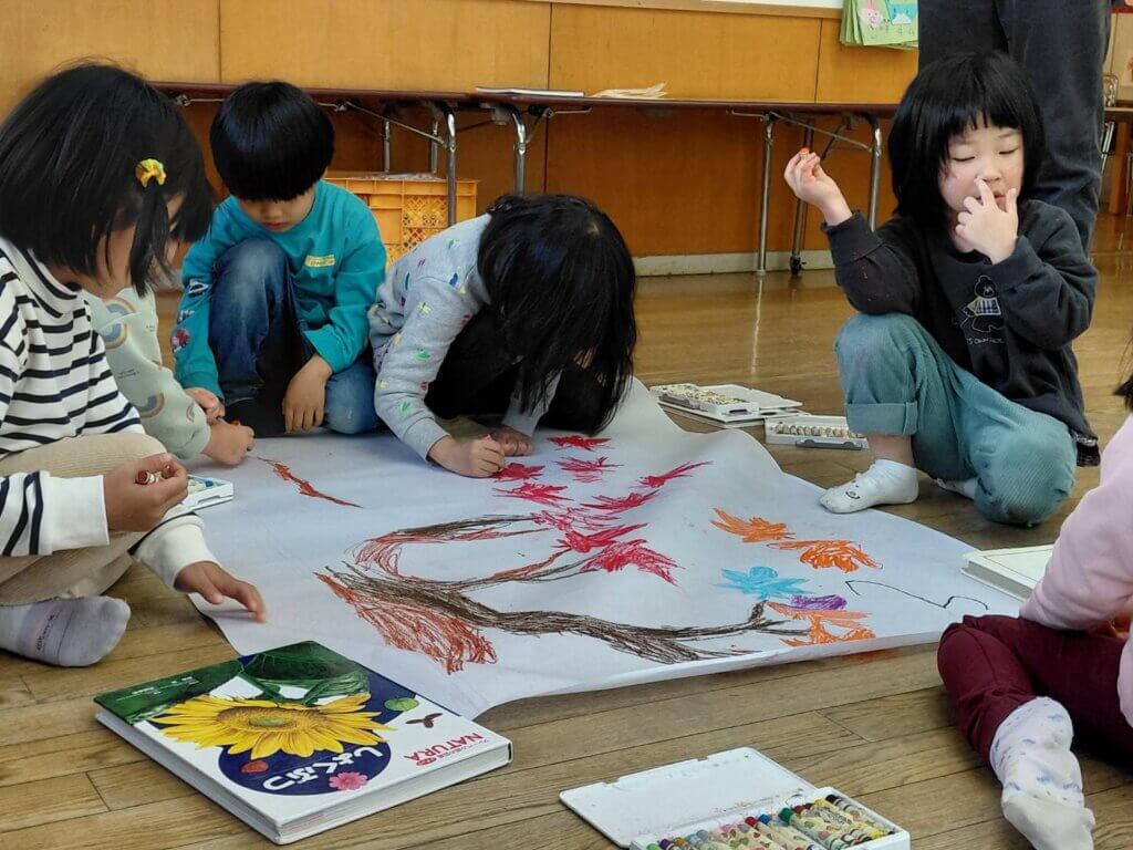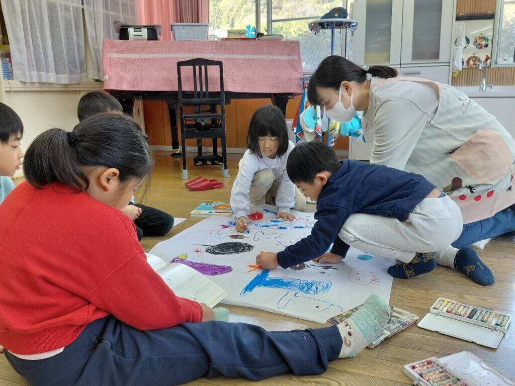 12月8日(月)、下分保育所で、上分・黒松八幡神社のライトアップに向けた襖絵の制作が行われました。園児たちは、自分の顔や秋の草木、海の生き物などをテーマに、思い思いの絵を描きました。