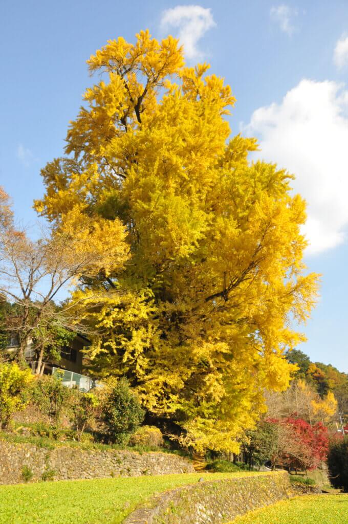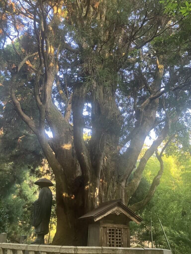 空に向かって燃え盛る炎のような枝ぶりで、圧倒的な存在感があるスギの巨木。推定樹齢は600年で、幹周7.62m、樹高約30m。弘法大師が焼山寺へ向かう途中に手植えをしたという伝説がある。昭和29年(1954年)に徳島県の天然記念物として指定された。