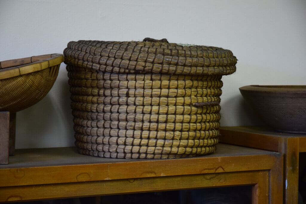 釜で炊いた熱々のご飯をお櫃に移し替え、さらにお櫃のご飯が冷めないように、保温性と通気性に優れた藁で編んだ籠の中に入れていました。主にご飯が冷めやすい冬に使われた民具です。“櫃ふご”、“藁いずみ”とも呼ばれます。