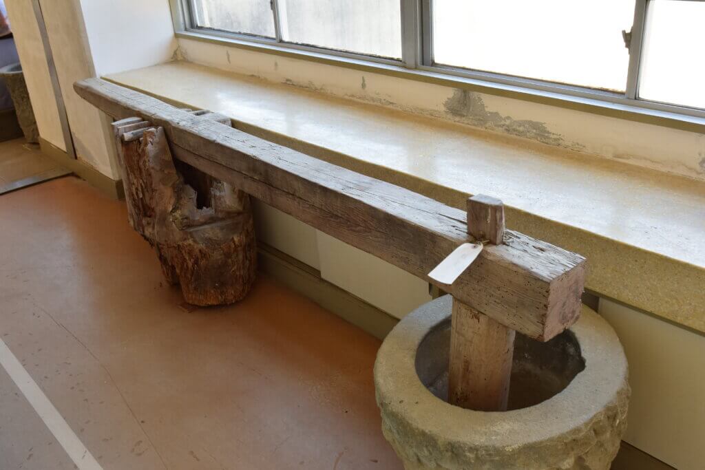 臼とつながれた長い柄を足で踏むことで、シーソーのように杵を上下させて、米や麦などを脱穀・精米するための農具。てこの原理を利用しているため、作業に力がいらず、女性や子どもでも簡単に使うことができました。これだけ大きなものはなかなか見られないので、とても貴重です。