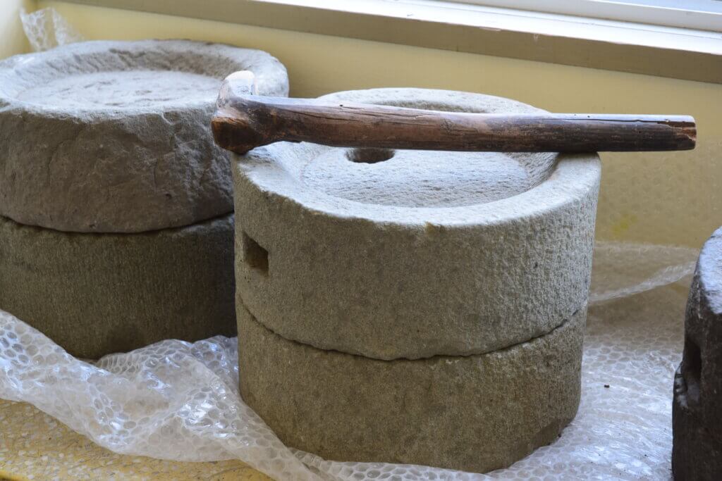 自分たちで種から育てた米や麦、そば、大豆などの穀物を挽いて粉にする臼。木の棒を持って上の臼を回転させ、穴から穀物を入れると、上下の臼が擦り合わさって、粒が小さく砕かれます。家庭に必ず一台はあって、挽いた粉で蕎麦を打ったり、自家製の豆腐や味噌をつくったりしていました。