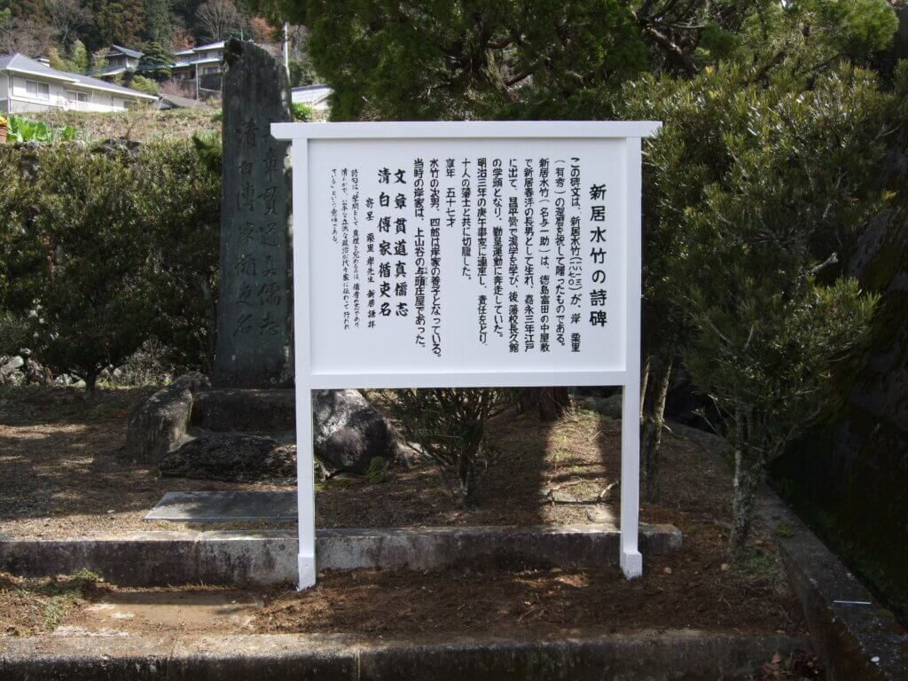 幕末の徳島藩を代表する儒学者であった新居水竹(すいちく)が、儒学者としても名高い岸 粟里(ぞくり)の還暦を祝って贈った詩を掘り込んだ石碑。当時の岸家は代々神領村の与頭庄屋を務めていた。水竹の次男・四郎が岸家の養子になっているなど、親交が深かった。