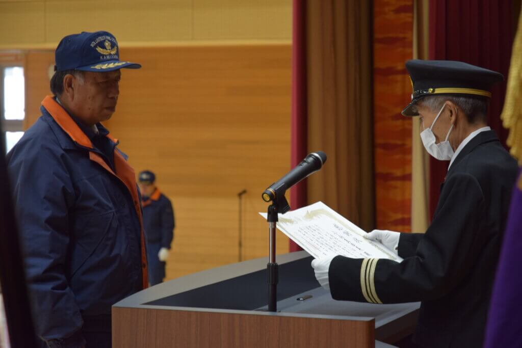 式典では、永年消防活動に功績のあった団員に表彰状や感謝状が授与され、また、初期消火に尽力いただいた住民の方々に感謝状が贈呈されました。