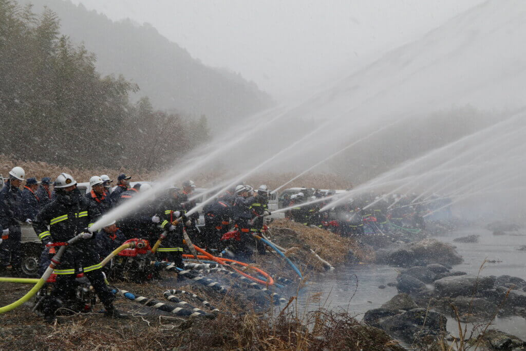 式典終了後には、小雪が舞う中、鮎喰川河川敷において1年の無事を祈念した一斉放水が行われました。